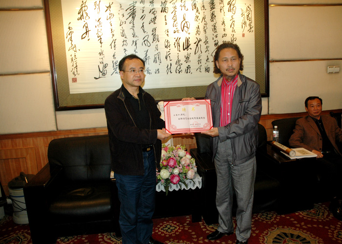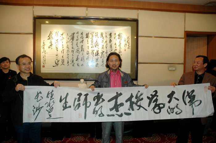 王教授说,一师是培养开国领袖毛泽东的摇篮,毛泽东的诗词、毛泽东的书法他一直都很喜爱,尤其是毛泽东的思想他特别推崇。他强调,毛泽东的思想是我们取之不尽、用之不竭的思想源泉,是永远不会过时的,他要以一位华侨华人艺术家的亲身经历和实际行动告诉大家、特别是要告诉已经富起来的中国人,不要忘记毛泽东的思想。今天他来到一师缅怀主席并聘为一师的客座教授,这让他再一次深受感动。王教授透露,他将于10月20日左右来湘举办“湖湘行”书画展,其书画作品将全部以伟人毛泽东、湖南老一辈无产阶级革命家和湖湘的山水风情作背景,将自己的湖南情、一师情融入其创作中。王德水教授把在5月17日特地书写的毛泽东的《沁园春·长沙》作品赠给学院,作品长度设计为9.9米,独具深刻寓意。他说:一是“九”表至尊;二是九月九日是人们纪念、缅怀、祭奠伟人毛泽东的日子,9.9米寓意为世人永远怀念伟人毛泽东!