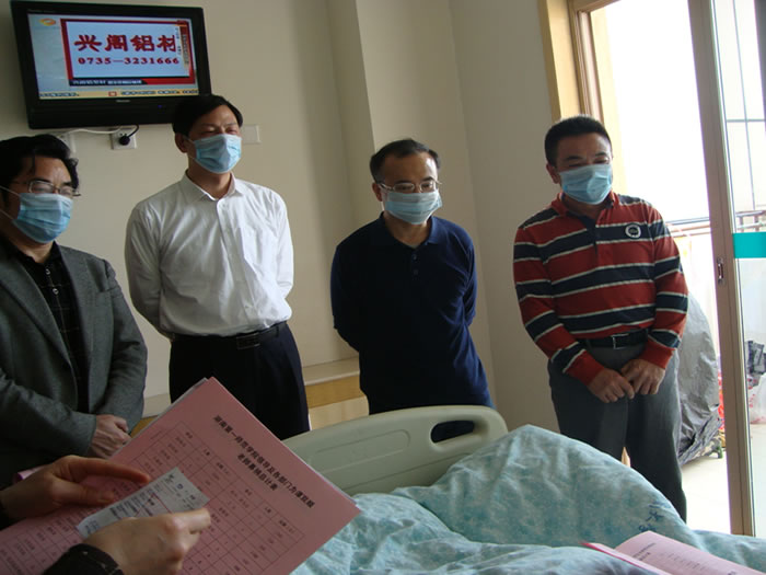 图为詹小平书记(右一)、彭小奇院长(右二)、李克勤副院长(右三)、阳柏苏书记(右四)在谭双顺老师病床前亲切慰问。