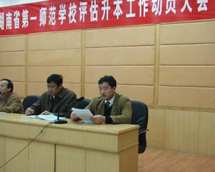 按会议议程,副校长李学全教授、副校长刘鸿翔副教授先后宣读了湖南省人民政府至教育部《关于请支持本科高等教育发展有关问题的函》和《湖南第一师范学校关于成立我校评估升本工作机构的通知》、《湖南省第一师范学校评估升本工作部门责任人及迎评专干名单》;评估升本办公室主任吴靖教授宣读了《湖南省第一师范学校评估升本工作进程安排》;王湘副书记宣读了《湖南省第一师范学校评估升本工作责任状》;最后,为贯彻落实责任,各部门评估升本责任人向詹小平校长呈递了评估升本工作责任状。