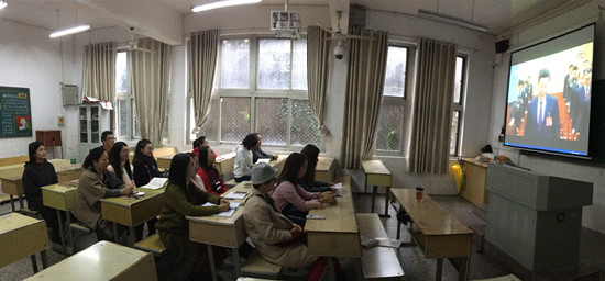 上午9时,十九大开幕会在庄严的国歌声中拉开帷幕,师生全体起立,共唱国歌。随后,全体师生为老一辈无产阶级革命家和革命先烈默哀。直播期间,视频会议室内师生聚精会神地观看聆听习近平总书记的报告,认真做着笔记,听到报告精彩之处自发为之鼓掌。