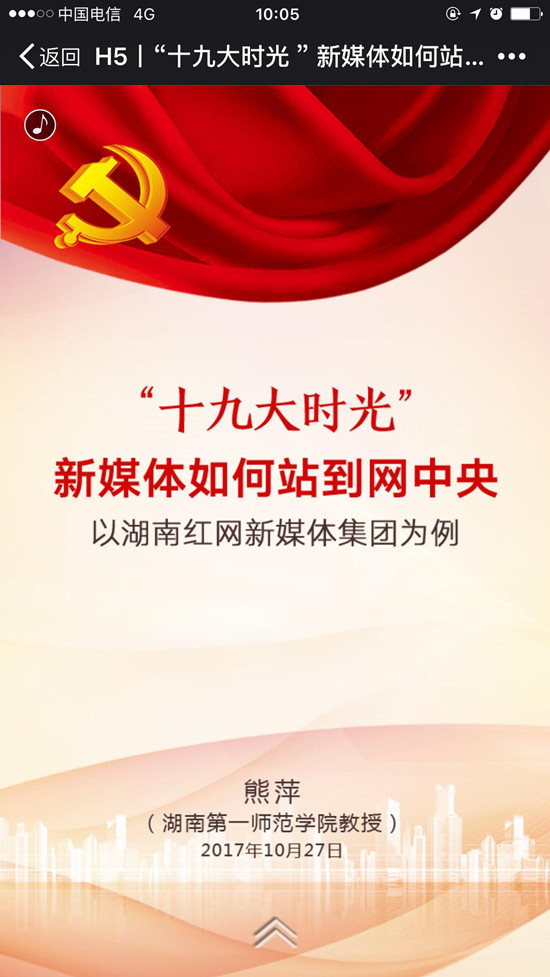 此外,她的《“十九大时光”新媒体如何站到网中央——以湖南红网新媒体集团为例》一文分析了湖南红网新媒体集团对于十九大的报道效果,并以H5(利用Html5的编码技术来实现的一种数字应用)的新颖形式进行传播。文章以湖南红网新媒体集团在十九大盛会的表现为例,分析了发布信息数量、点击量、转载量,指出红网新媒体巧用聚合,深耕内容,力推小而美的新闻,强化互动,激活路径,矩阵联动,取得了良好的传播效果。