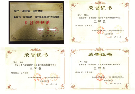 在长沙市全民国防教育委员会、中共长沙市委宣传部、长沙市教育局联合主办的长沙市“爱我国防”大学生网络演讲比赛中,我校积极发动、组织学生参赛。经过学院推荐、学生工作部(处)组织专家团队评审,共推荐六件作品参赛,最终我校荣获最佳组织奖;数学与计算科学学院王文权获得二等奖,文学与新闻传播学院徐红、沈阳分别获得三等奖。