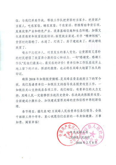 一封感谢信表达出双峰县委县政府对我校精准扶贫工作的高度认可,一声“感谢党、感谢工作队”表达了村民们对我校扶贫工作的真诚赞誉。在今后的扶贫道路上,我校将一如既往地真帮实扶,帮助帮扶点的乡亲们脱贫致富、共奔小康!