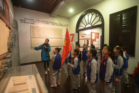 在纪念馆讲解员的带领下,斑马湖小学全体师生首先参观了毛泽东与第一师范纪念馆,感受到青年时代毛泽东的勤奋好学与坚定的理想抱负。毛泽东当年伏案苦读的课桌椅依然保存完好,经常进行冷水浴以强身健体的水井也风采依旧,与志同道合的同学彻夜畅谈救国救民信仰的寝室同样完整保留,在一师迂回绵延的走廊间穿梭,仿佛时光倒回,老师和孩子们一起随着眼前的一切回到了从前。