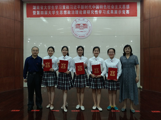 5月26日,由省委教育工委、省教育厅主办的湖南省大学生学习贯彻习近平新时代中国特色社会主义思想暨第四届大学生思想政治理论课研究性学习成果展示竞赛决赛在我校举行。我校由宋徽瑾、邱荷老师指导,数学与计算科学学院2016级六年制公费定向师范生李格京、成朝霞、刘婕、左梦科、李晶琳组成的研究性学习小组荣获全省唯一特等奖,宋徽瑾、邱荷老师荣获“优秀指导老师”奖。