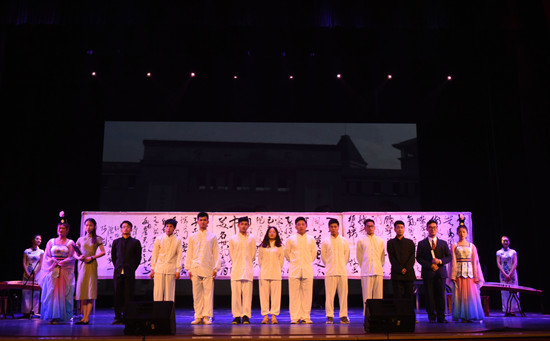 晚会共分为缅怀伟人、践行初心、放飞梦想三个主题篇章。开场舞《奋进新时代》以轻快的节奏,欢乐的旋律,尽显一师的蓬勃朝气,展现出新时代一师人对祖国的热爱和为教育事业付出的决心。在“缅怀伟人”篇章,大合诵《毛泽东经典诗词诵读》,深情诵读了伟大校友毛泽东的经典诗句,展现出毛泽东的革命人生与磅礴情怀,表达一师师生对伟人的崇敬与怀念;"寂寞嫦娥舒广袖,万里长空且为忠魂舞",钢琴伴奏独唱《蝶恋花·答李淑一》的词为毛主席抒发悼念情感之作,表演者一声开嗓便震撼人心,饱含深情的唱词让在场观众无不深受感染,真切体会到了革命先烈们生死不渝的情怀。在“践行初心”篇章,朗诵《我的学生我的爱》,讲述了毕业后回到郴州桂东县四都镇乡村小学任教的我校4位校友在工作中的感人故事,让观众真切感受到师范毕业生在教育路上从稚嫩到成熟的成长历程,同时,表达了一师学子献身农村基础教育的坚定信念;双钢琴《红旗颂》以宏伟庄严的旋律表现了中国人民英勇顽强、奋发向上的革命气概,热烈讴歌了伟大祖国蒸蒸日上的繁荣景象;歌曲《黄河颂》大气磅礴,让人热血沸腾;书画《翰墨诗情映丹青》节目在古韵的墨香中穿越书法的妙境、体会超越喧嚣的翰墨诗情,伴着优雅的琴韵让人回想到这样一段故事:1918年4月,新民学会成立,6月,毛泽东等一师学子即将毕业,为寻求救国救民之路,新民学会资助罗章龙先行东渡日本。临行前,毛泽东作了一首充满了依依惜别之情又洋溢着浩然之气的《送纵宇一郎东行》为其送别。美术与设计学院书法学专业的毕业生代表在临别之际,特书写此诗,以表达对伟大校友的深切怀念,也以此鼓励一师毕业生,走向社会,追逐自己美好的人生之梦、中华民族伟大复兴之梦。在“放飞梦想”篇章,啦啦操《舞动青春》活泼热情,展现出年轻一代一师学子的蓬勃朝气,高超炫丽的技艺点燃全场激情,近年来,我校学生健美操啦啦操运动队表现优异,连续7年蝉联湖南省大学生健美操比赛团体总分第一名,并斩获58枚单项金牌;“恰同学少年”合唱团带来的合唱《雪花的快乐》《鸿雁》将曲风截然不同的两首歌曲巧妙融合,高低起伏,刚柔并济,寓意辽阔的天空任飞翔。