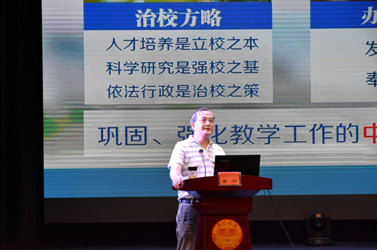 曹兴首先全面介绍了我校的治校方略、办学宗旨以及肩负使命。其次,对我校12个教学院部的教学特色以及建设思路进行了详细介绍,重点讲解商学院未来的工作规划以及目标愿景等。最后,他结合自己的人生经历与经验给予新生们关于大学生活的建议。