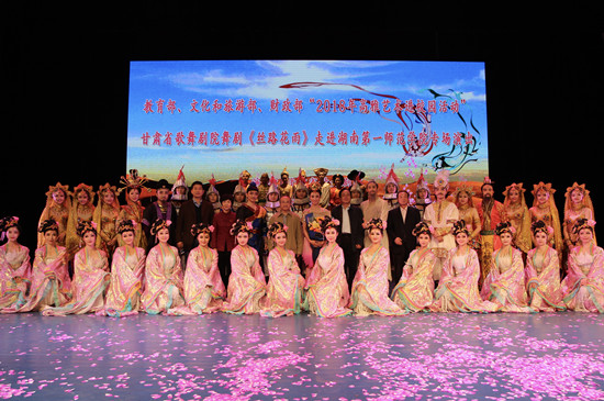 10月22日晚,由国家教育部、文化与旅游部、财政部主办的高雅艺术进校园活动走进我校,甘肃省歌舞剧院带来的中国经典舞剧《丝路花雨》在我校东方红校区田汉剧场唯美上演。省教育厅体卫艺处处长彭四龙、调研员金彪应邀出席。校党委书记彭小奇、校长童小娇、党委副书记刘志敏、纪委书记李昱与1100余名师生代表一道观看了演出。