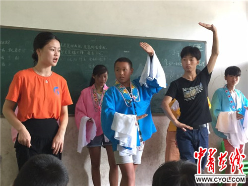 在湖南省湘西自治州永顺县老司城村的一所小学里,初来乍到的大学生一放下行李,就布置出来一个湘剧文化艺术广场:民族乐器秀、戏曲脸谱秀、湘剧服装秀、湘剧身段秀等一一亮相,让孩子们惊喜不已。随后,陆续安排的湘剧体验活动,让小朋友们可以穿湘剧服装、练习湘剧身段,欣赏《描容上路》、《赠剑》等湘剧片段,年纪大一点在跟着大学生用湘剧高腔唱《学习雷锋好榜样》和湘剧现代戏《月亮粑粑》,可谓是扎扎实实地过了一把湘剧“瘾”。