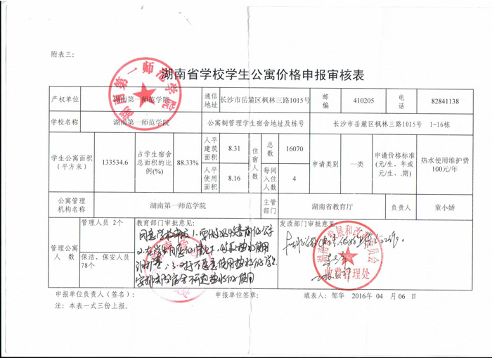 按照湖南省物价局、湖南省教育厅关于印发《湖南省学校学生公寓价格管理办法》湘价教〔2012〕112的通知,学生公寓配备了热水供应并确保学生使用热水的,在已定类别价格标准的基础上,按规定每人每年收取热水使用维护费100元,热水费计量由学生缴费。 我校东方红校区学生公寓1-16栋热水系统已于2015年12月建设完毕并已正常投入使用。经学校申报,省教育厅、省发改委现场调研后批准,学校按规定收取热水使用维护费100元/每生每年,从2016年9月新学期开始执行。如有不需要热水的同学,请在7月30日前在学院登记,学院汇总后,交学生工作处,统一安排宿舍。热水费计量收费,40元/吨。从2016年1月开始执行。