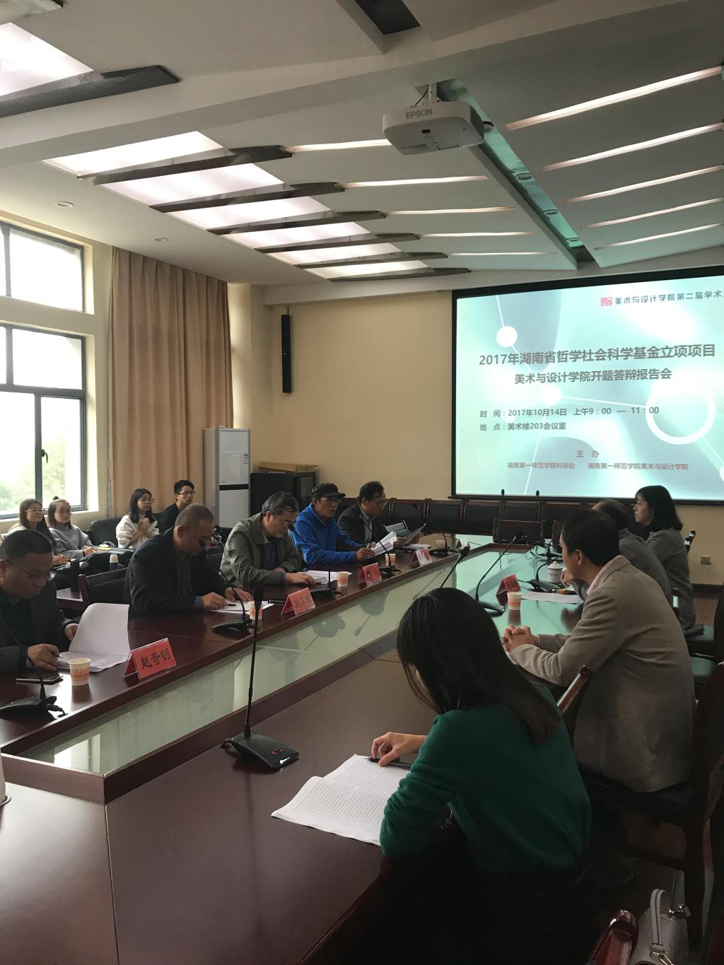 10月14日上午,2017年湖南省哲学社会科学基金美术与设计学院立项项目开题答辩报告会在美术楼会议室召开。我校副校长曹兴教授、湖南师范大学美术学院谢雱教授、中南林业科技大学家具与艺术设计学院院长刘文金教授、湖南理工学院美术学院党总支书记洪琪教授、我校科研处处长赵奇钊教授作为答辩专家出席并听取了报告。本次答辩报告会由美术与设计学院院长范迎春教授主持。