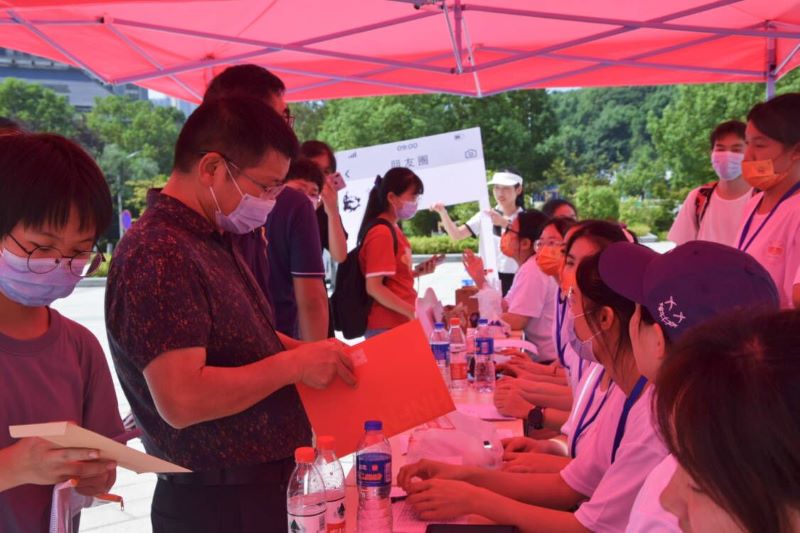 在校团委学生干部志愿服务点,“新生报到合影牌”格外引人注目,新生在这里打卡校园、拍照留念。在双创楼报到点,商学院为每位新生准备了精美的红玫瑰、“甜甜饼干墙”。马克思主义学院、体育学院为新生的到来准备了“今天开学了”、“我的新家,未来的四年要更加努力”等字样的“朋友圈打卡留影框”,校园内处处洋溢着迎新的喜悦。