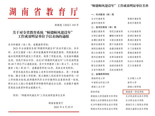 近日,湖南省教育厅公布了《“师德师风建设年”工作成效明显单位名单》,对“师德师风建设年”工作成效明显的49个单位予以通报表扬,我校荣列其中。
