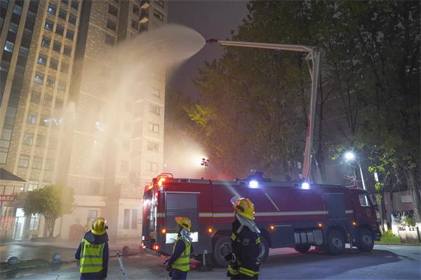 本次演练为模拟学校培训楼5楼发生火灾、4名学生被困的场景。4月10日傍晚18:30,5楼楼道内涌出滚滚浓烟。“起火啦!”临近人员发现着火后,第一时间使用灭火器进行扑救,大声呼喊,并按下最近的手动报警器,消防控制室值班人员接到警报后,立即通知学校志愿消防队伍赶赴现场扑救,并拨打报警电话,同时向学校应急指挥部报告。学校应急指挥部立即启动应急预案,安全警戒组、医疗救护组、灭火行动组、疏散引导组等应急小组随即到位,学生们迅速有序地从宿舍撤离到安全区域。