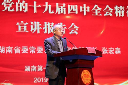 11月25日下午,学习贯彻党的十九届四中全会精神省委宣讲团首场报告会在我校东方红校区田汉剧场举行,省委宣讲团成员、省委常委、省委宣传部部长张宏森为我校师生做现场报告。会议由校党委书记彭小奇主持。