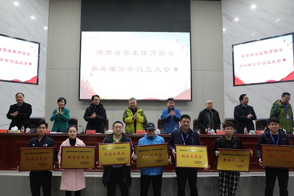 王柯敏、葛洪元、王瑰曙、彭小奇共同为湖南省学生体育协会乒乓球分会揭牌。随后,大会为会长单位和副会长单位授牌,并为会长、副会长、秘书处主任颁发聘书。