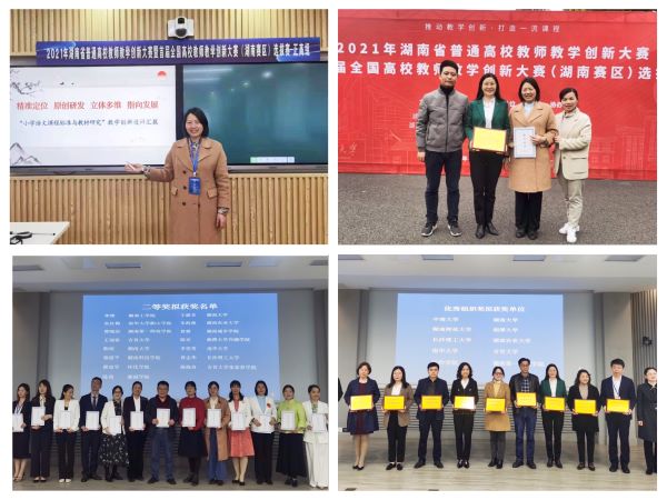 4月17日,2021年湖南省普通高校教师教学创新大赛暨首届全国高校教师教学创新大赛(湖南赛区)选拔赛决赛在湖南大学举行。我校教育科学学院曾晓洁教授的教学团队荣获二等奖(全省正高组一、二等奖获奖总人数仅8名),我校获评“优秀组织奖”。