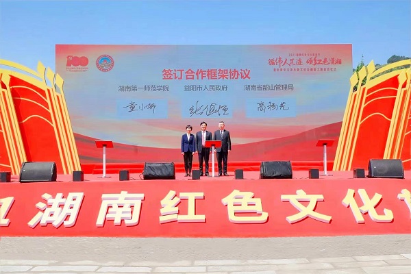 4月29日,由益阳市人民政府、湖南省文化和旅游厅、湖南省韶山管理局与我校共同主办的2021湖南红色文化旅游节——重走青年毛泽东游学社会调查之路启动仪式在安化县梅城镇文武庙古建筑群前坪举行。