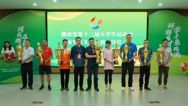 9月30日,湖南省第十二届大学生运动会在湖南理工学院落下帷幕,我校代表团167名运动员共参加武术、田径、羽毛球、跆拳道、啦啦操、健美操、足球、篮球、乒乓球、游泳10个项目比赛,经过为期25天的激烈角逐,共获得金牌7枚、银牌7枚、铜牌8枚,团体总分在全省24个学院组中排名第八,学校代表团被评为“优秀代表团”,同时被授予“湖南省第十二届大学生运动会校长杯”荣誉称号。