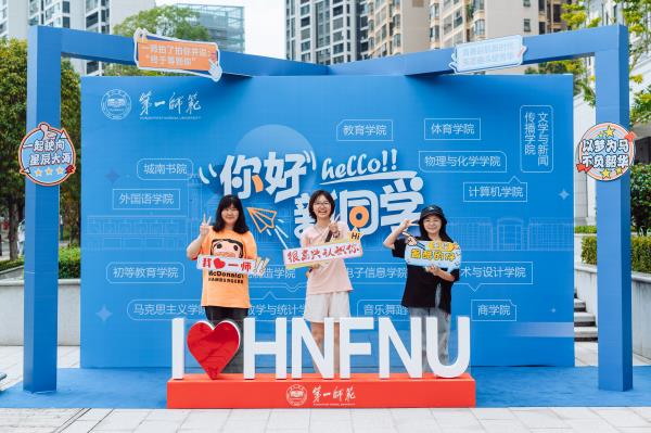 “‘初’见倾心,‘教’我欢喜”,初等教育学院的迎新点矗立着一面由新生名字组成的学院名称的打卡墙。新生们还可以在打卡墙上的“初等教育学院”中找到自己的名字,用迎新点准备好的打卡牌同家长一起和自己的“新家”合影纪念,这样的创意收获了新生和家长们的一致好评。