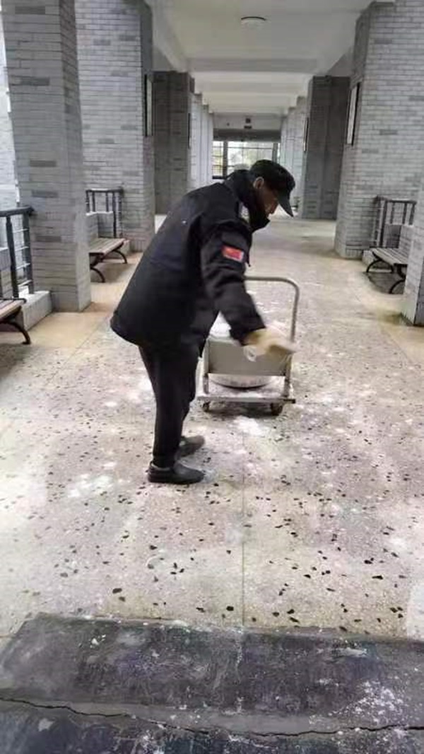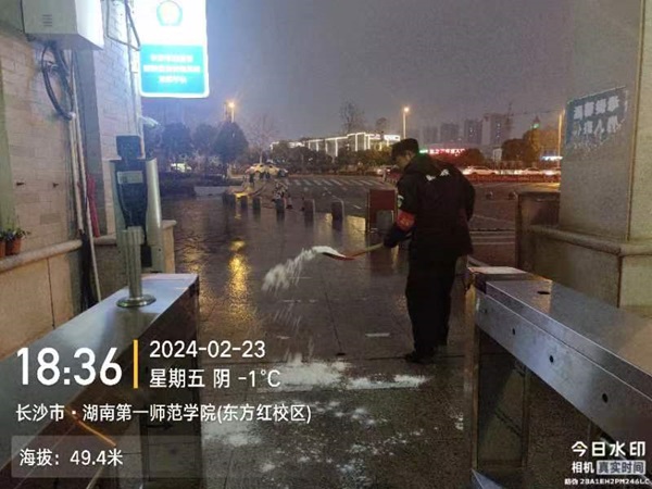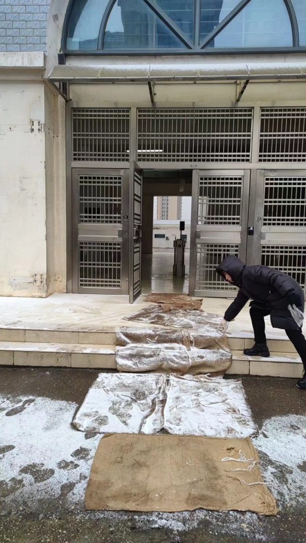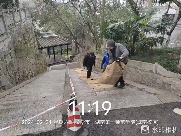 2月19日至25日,后勤处、保卫处、学工处等部门加强了对校舍、在建工程和校园周边等地安全巡查,落实做好在校师生防冻防寒、生活保障等防范应对工作,配齐备足相关保障物资,力保校园生活秩序正常。重点对教学区、办公区、生活区、道路区进行防范和处置,摸排各个区域路面冰冻情况和水电管道情况,根据具体情况分别采取撒盐、铺麻袋、松水阀、包水管等应对措施,动态发布师生员工校内安全通行温馨提示,确保水管不因冰冻爆裂,确保师生不因路面冰冻摔伤事故发生。
