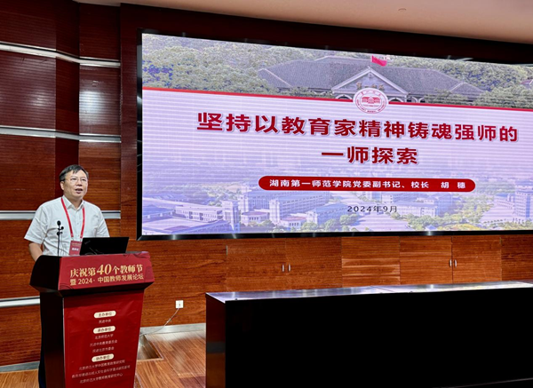 论坛上,胡穗以“坚持以教育家精神铸魂强师的一师探索”为题作专题报告,从“加强思想政治建设,坚定教师理想信念;强化校园文化浸润,陶冶教师道德情操;开发平台课程资源,涵养教师育人智慧;赋能教师终身发展,激发教师躬耕态度;注重专业情意教育,勤修教师仁爱之心;推动思政育人改革,树立教师弘道追求”六个方面分享了我校推进以教育家精神强师铸魂的实践体会。他指出要进一步深入贯彻落实习近平总书记考察我校的讲话精神,深化教育家精神系统性研究阐释,细化教育家精神分层涵养机制,活化教育家精神传播资源和载体,强化教育家培育弘扬的保障机制,坚持以教育家精神铸魂强师,擦亮“第一师范”的“金字招牌”。