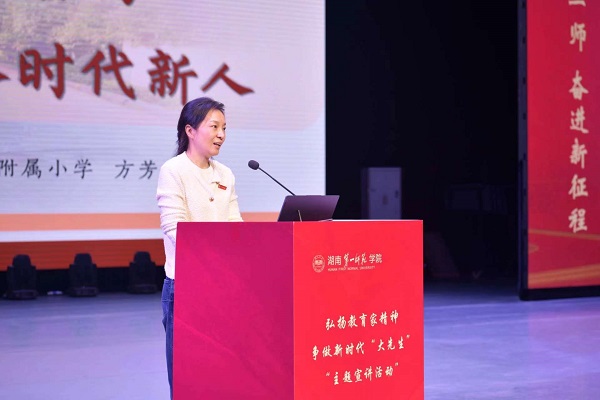全国优秀教育工作者、湖南一师一附小党支部书记、校长方芳,以“传承红色基因,培养时代新人”为主题,讲述了如何用好“红校史”育人资源推进红色师德铸魂、红色基因塑心,分享了自己忠诚教育事业、用心研究儿童并潜心培育良师的坚定信念与育人故事。