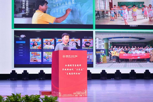 全国优秀教师、全国乡村优秀青年教师、郴州市桂阳县荷叶镇中心学校党支部书记郭泽宇,以“以梦为马,争做新时代的人民教育家”为主题,分享了自己对人民教育家的理解与志向,介绍了大学期间修学储能以及走上工作岗位后坚定理想信念、用爱帮扶感化学生、用心务实创新的故事。