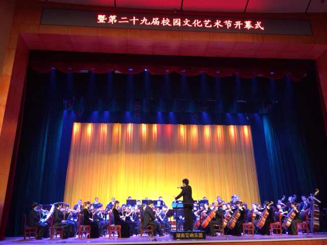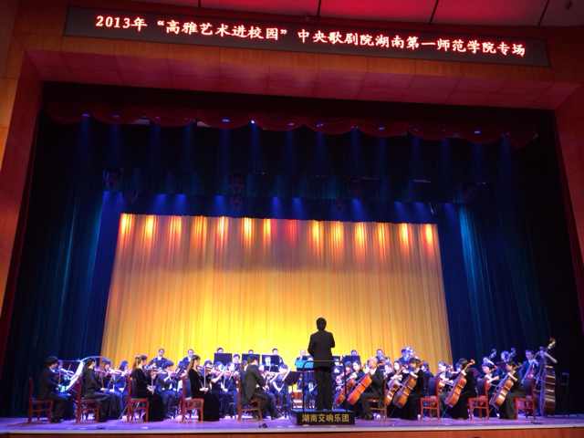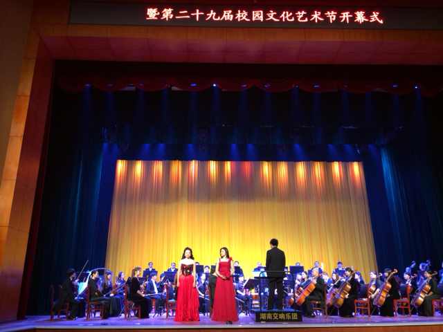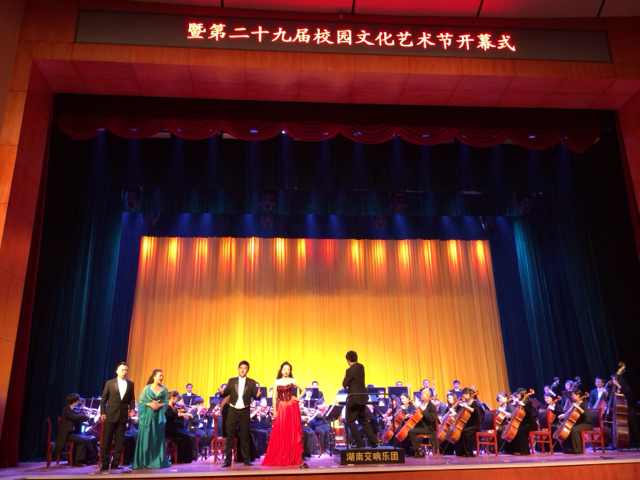 演出在慷慨激昂的《卡门》序曲中拉开序幕。中央歌剧院著名艺术家王红、耿哲、王立民、向子文等用纯熟的意大利语、法语深情演绎了《卡门》选曲、《弄臣》选曲、《图兰朵》选曲、《茶花女》选曲等世界歌剧经典曲目。女中音歌唱家孙雪曼以《卡门》选段《爱情像一只自由鸟》呈现出吉普赛女郎卡门风情万种、摄人心魄的魅力;男中音独唱《斗牛士之歌》节奏有力,浑厚且富有磁性;《乡村骑士》间奏曲旋律宽广,寓意深厚;歌剧《弄臣》的混声四重唱生动地展现出不同人物的内心世界。期间,艺术家与我校学生互动,默契配合,完成《茶花女》的歌剧场景演出。优美的歌剧旋律、高超精湛的表演及幽默风趣的主持使现场观众深深领略到了歌剧艺术的魅力。同时,中央歌剧院歌剧团交响乐团和湖南交响乐团高水准的伴奏以及青年指挥家周小诗的指挥艺术,也折服了现场所有观众。