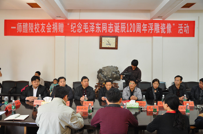 今年是毛泽东主席诞辰120周年,同时也是毛泽东主席求学一师100周年、我校建校110周年。10月26日,我校醴陵校友会的9名校友代表专程回到母校,捐赠了“纪念毛泽东同志诞辰120周年浮雕瓷像”及一批醴陵釉下五彩瓷珍品。