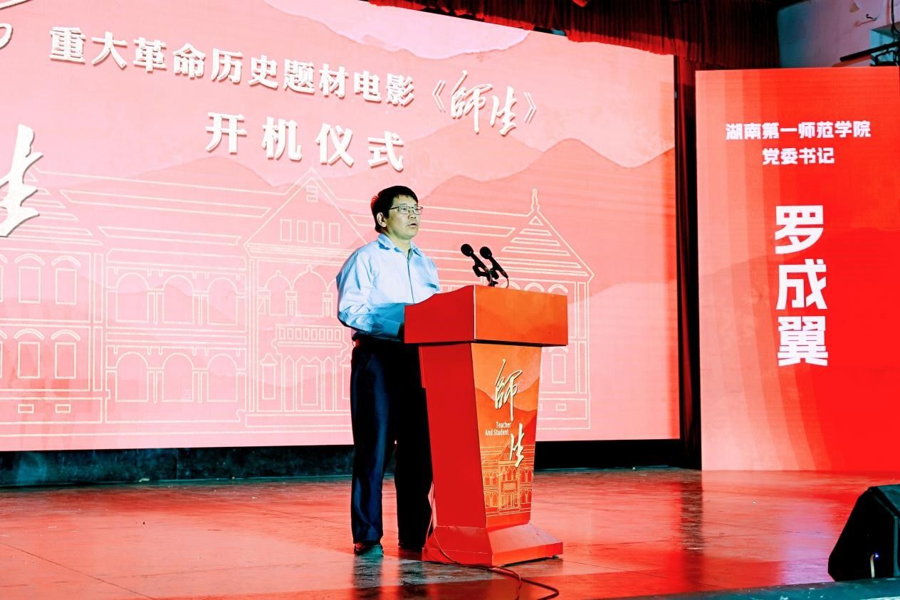 在开机仪式上,罗成翼介绍了学校的基本情况,并重温了习近平总书记来校考察时的重要讲话精神。他指出,电影《师生》的拍摄,是贯彻习近平总书记考察我校重要讲话精神和教育家精神的生动实践。影片以毛泽东与杨昌济、徐特立、袁吉六等老师的深厚情谊为脉络,以跨越时空的叙事手法生动展现他们之间的交往故事,深刻彰显这些“大先生”的崇高风范及一代伟人的深厚家国情怀,这既是对我校早年办学方针和办学成效的高度认可,也是对新时代如何处理师生关系、培育时代新人的深刻启示。