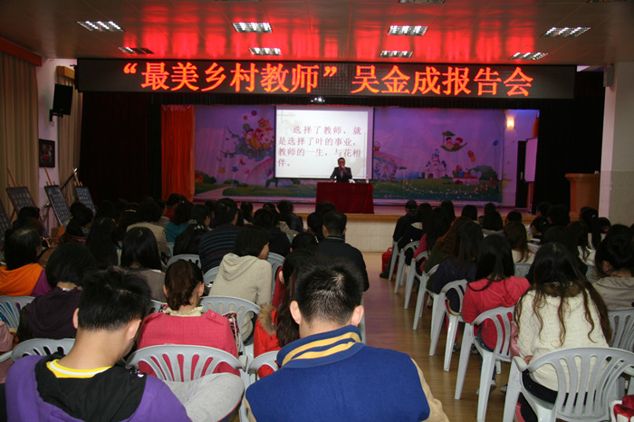 吴金成老师的报告没有华丽的辞藻,没有煽情的语调,但是他为学生做的点点滴滴是那么朴实、感人。他鼓励孩子们树立自信心;带领孩子们跳绳;用自己微薄的工资给孩子们购买奖品;为孩子们增添营养自购豆浆机 、自接电源;桌椅坏了亲自动手修理;送孩子们回家;努力教孩子们更多的知识;走家串户劝更多的孩子来上学……