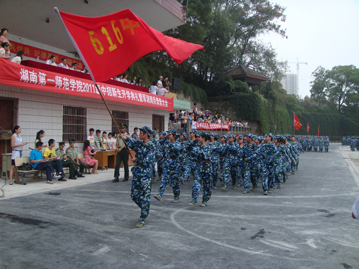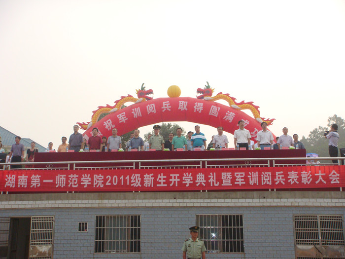 伴着雄壮激越的《检阅进行曲》,院党委书记詹小平在武警湖南省总队直属支队徐四海中校的陪同下检阅了2011级新生。“同学们好”、“首长好”、“同学们辛苦啦”、“为一师增光”的声音回荡在田径场上空,经久不息。