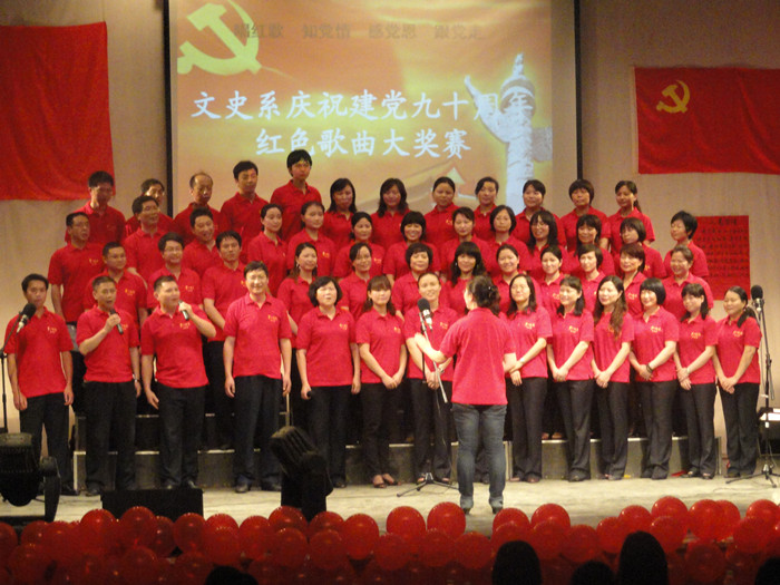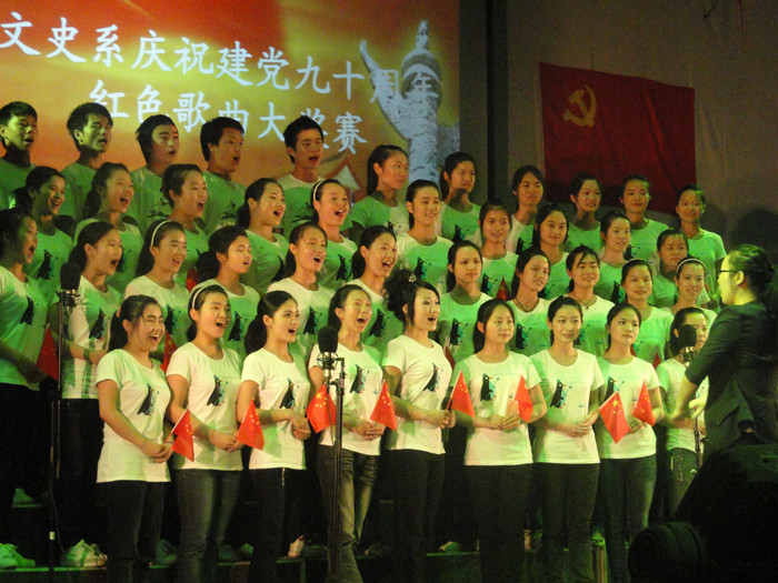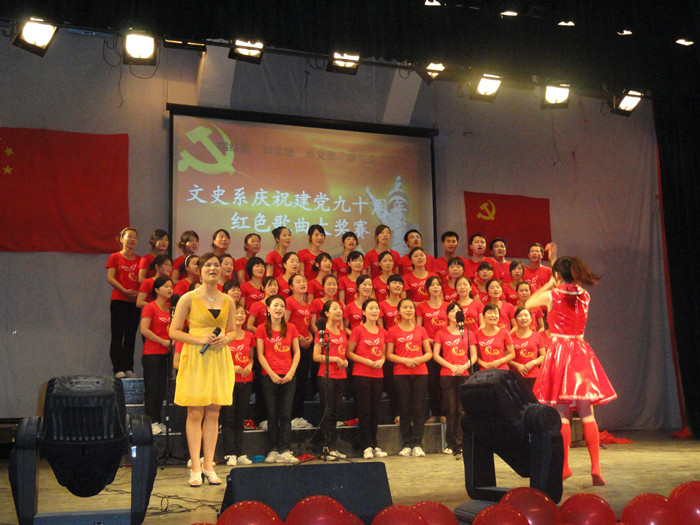 6月7日下午,由文史系党总支举办的“唱支歌儿给党听”——庆祝建党90周年红色歌曲大奖赛暨文史系新党员宣誓、优秀学生党员表彰、爱心助学金颁发仪式在东方红校区科技楼演播厅隆重举行。学院副院长刘志敏,学生工作处处长何文,院团委书记任晓晴,文史系党总支书记雷庆娥、系主任刘澍心、副主任邓绍秋、副书记陈天涯以及近500名师生出席了本次活动并观看了比赛。