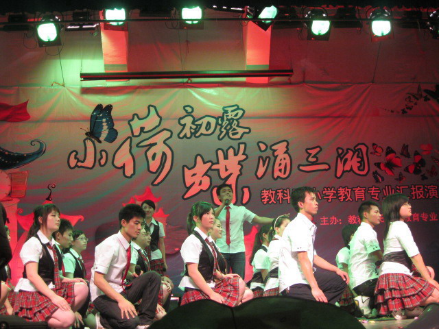 教育科学系08级小学教育专业189名学生共同筹划的这场专业汇报演出以“小荷初露,蝶涌三湘”为主题,以学生的成长足迹为主线,分为“小荷尖尖”、“锋芒初露”、“破茧成蝶”、“涌动三湘”四大篇章。构思精巧,场景绚丽,形式多样、充满新意,给观众带来了一种全新的视觉和听觉感受,充分展示了08级小学教育专业学生扎实的专业功底和良好的职业风采。