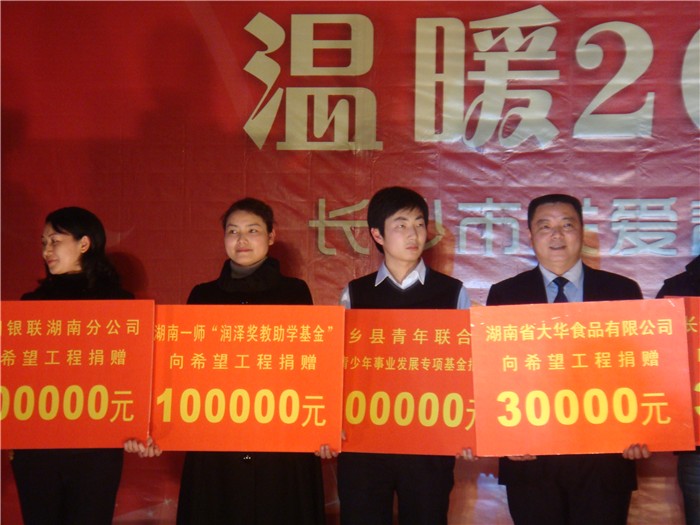 晚会上,长沙市青基会播放了2010年活动视屏,展示了众多捐赠活动中涌现出的先进典型的先进事迹,我院“润泽奖助学基金”项目得到重点推介。此项目旨在通过各种社会渠道筹集资金,资助我院贫困学子在校期间的学习生活,奖励我院优秀教师,或用于改善办学条件。晚会现场,我院为长沙市青少年基金会现场捐赠人民币拾万元整,被组委会评为长沙市“希望工程贡献单位奖”,这是省属高校中唯一获此殊荣的单位。