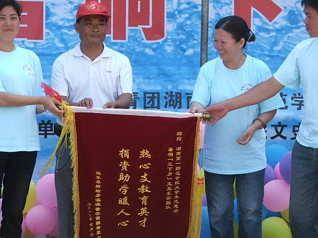 接着,陈天涯副书记代表院团委及文史系党总支、团总支向溪源小学和八位贫困生捐赠了2970元助学金、500余册书籍及大量文体用品。溪源小学李平飞校长对志愿者的工作予以肯定并作了高度评价,并向支教队赠送了“热心支教育英才,捐资助学暖人心”的锦旗。