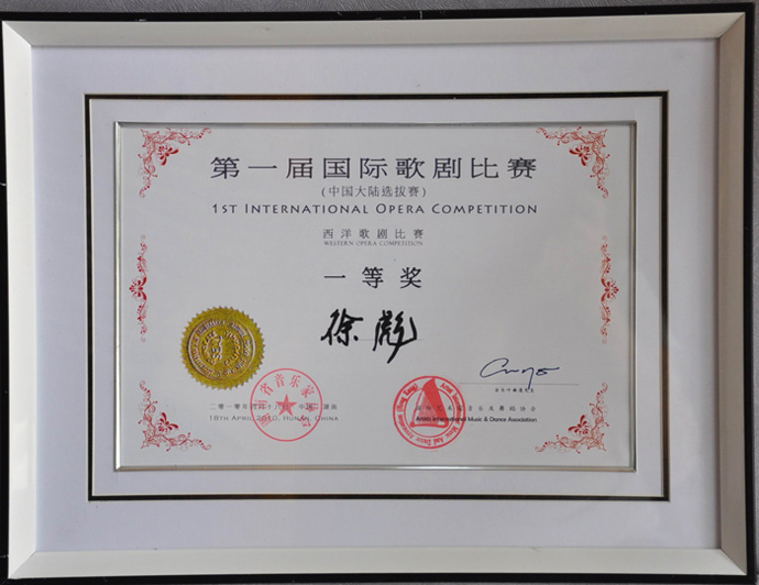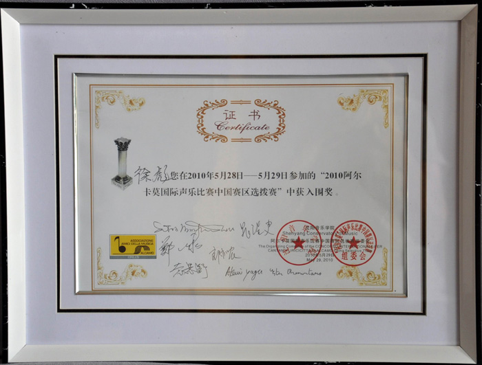 事隔十天,即2010年5月28日至29日,徐彪老师又获得文化部指定的重大国际声乐比赛“2010意大利阿尔卡莫国际声乐比赛中国赛区选拨赛”入围奖,入围今年9月在意大利阿尔卡莫的决赛。