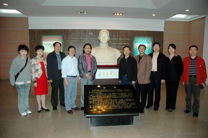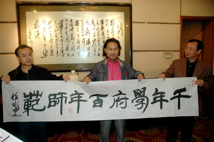 王教授说,一师是培养开国领袖毛泽东的摇篮,毛泽东的诗词、毛泽东的书法他一直都很喜爱,尤其是毛泽东的思想他特别推崇。他强调,毛泽东的思想是我们取之不尽、用之不竭的思想源泉,是永远不会过时的,他要以一位华侨华人艺术家的亲身经历和实际行动告诉大家、特别是要告诉已经富起来的中国人,不要忘记毛泽东的思想。今天他来到一师缅怀主席并聘为一师的客座教授,这让他再一次深受感动。王教授透露,他将于10月20日左右来湘举办“湖湘行”书画展,其书画作品将全部以伟人毛泽东、湖南老一辈无产阶级革命家和湖湘的山水风情作背景,将自己的湖南情、一师情融入其创作中。王德水教授把在5月17日特地书写的毛泽东的《沁园春·长沙》作品赠给学院,作品长度设计为9.9米,独具深刻寓意。他说:一是“九”表至尊;二是九月九日是人们纪念、缅怀、祭奠伟人毛泽东的日子,9.9米寓意为世人永远怀念伟人毛泽东!