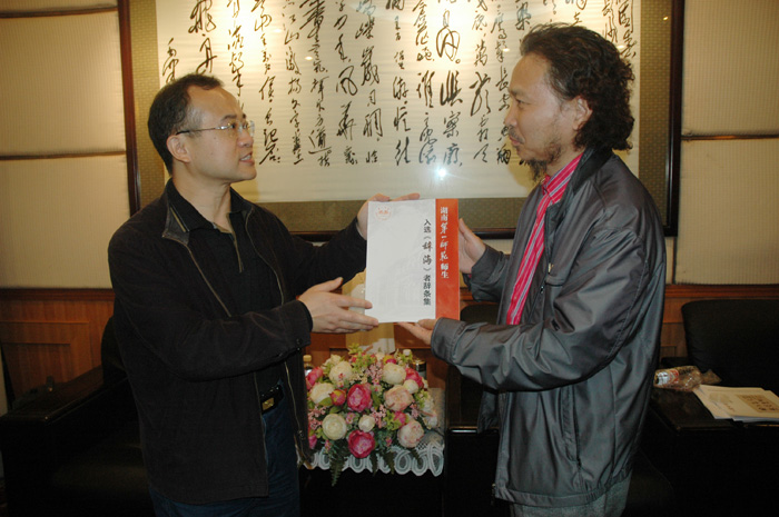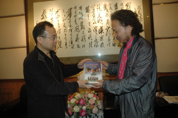 彭院长代表学院也赠给王教授三件礼物:毛泽东在第一师范时期的部分资料汇编、电视剧《恰同学少年》光碟和《湖南第一师范师生入选〈辞海〉者辞条集》。