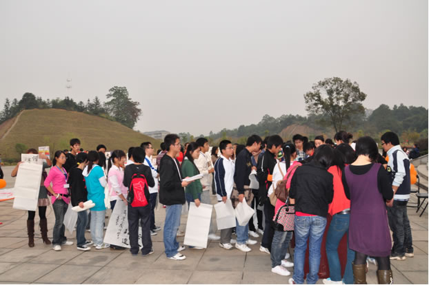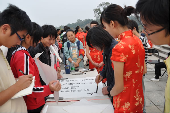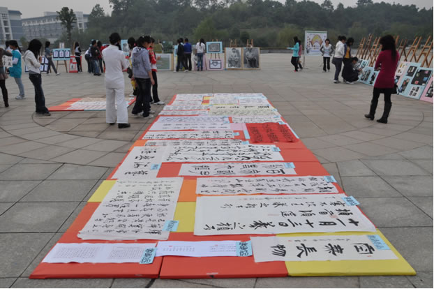 整个展区分为书法、绘画和摄影三个区域,共展出近一百五十件作品。为了开阔我院学生的视野,促进艺术交流,这次作品展不仅特邀了省级知名书法家和部分高校书画爱好者的作品参展,而且还特邀了陈共华、刘木、陈泽忠三位嘉宾挥毫泼墨,现场献艺。截止下午六点多,广场上人头攒动,观展的同学依然络绎不绝,书法爱好者还手拿宣纸排着三列长长的队伍,等候嘉宾为自己书写箴言警句以自勉。