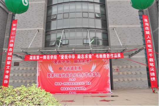 10月28日下午,东方红校区图书馆前坪广场彩球高悬、条幅高挂,由院党委宣传部、团委和湖南省大学生书画艺术联合会共同主办的“爱我中华,励志求索”书画摄影展暨第25届校园文化艺术节开幕式在此隆重举行。副院长李学全、院党委宣传部部长陈志武、团委书记任晓晴,特邀嘉宾湖南省硬笔书法家协会副主席陈共华和协会中心主任潘锋、湖南省大学生书画艺术联合会主席刘木等出席了开幕式。团委书记任晓晴老师致开幕词,陈共华老师和刘木老师发表了热情洋溢的讲话。