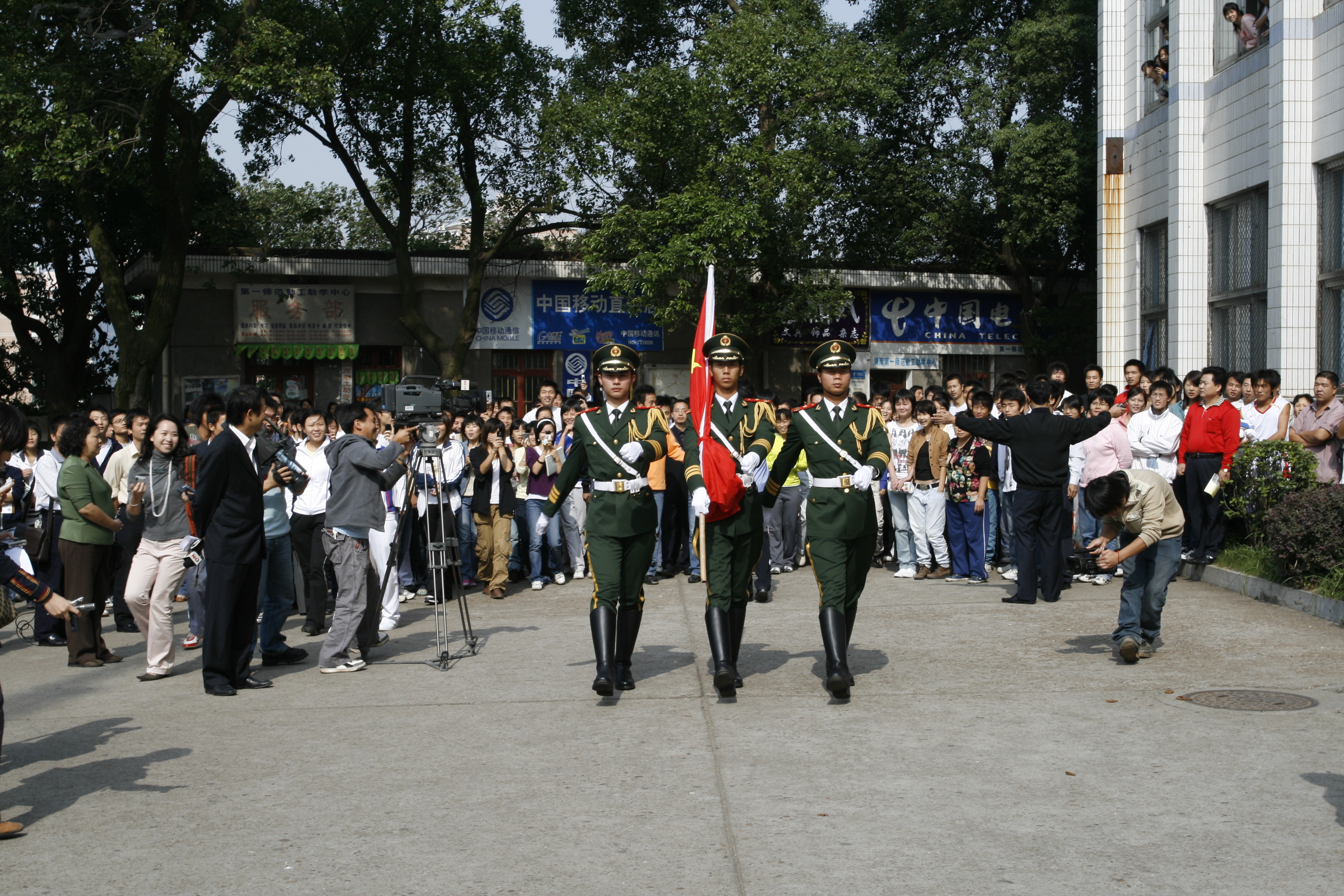 2007年10月8日,北京天安门国旗护卫队战士在我校城南书院校区举行庄严而隆重的升国旗仪式。