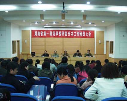 按会议议程,副校长李学全教授、副校长刘鸿翔副教授先后宣读了湖南省人民政府至教育部《关于请支持本科高等教育发展有关问题的函》和《湖南第一师范学校关于成立我校评估升本工作机构的通知》、《湖南省第一师范学校评估升本工作部门责任人及迎评专干名单》;评估升本办公室主任吴靖教授宣读了《湖南省第一师范学校评估升本工作进程安排》;王湘副书记宣读了《湖南省第一师范学校评估升本工作责任状》;最后,为贯彻落实责任,各部门评估升本责任人向詹小平校长呈递了评估升本工作责任状。