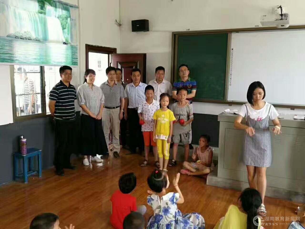 赵小群(左一)陪同双峰县委副书记杨萍(左二)观看湖南一师“三下乡”支教活动。