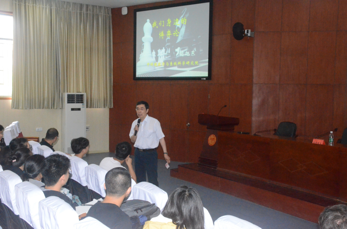 5月17日上午,应我校数学与计算科学学院的邀请,中国科学院数学与系统科学研究院研究员胡旭东老师在特立南210会议室为我校师生作了题为“我们身边的博弈论”的科普报告。数学与计算科学学院副院长欧阳章东主持了讲座,数学与计算科学学院、商学院、信息科学与工程学院的老师和学生聆听了此次报告。