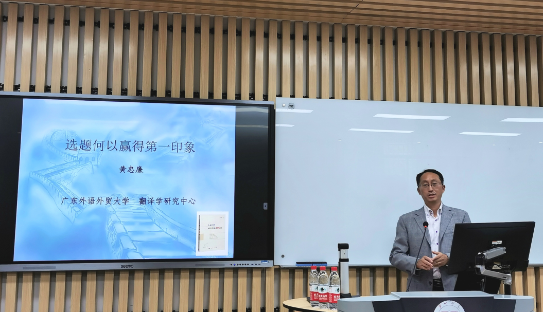 13日上午,黄教授与外国语学院领导进行座谈,就学科发展状况、未来发展目标等展开了深入讨论。13日下午,黄教授首先在怀中楼南栋209举行了题为“翻译呈反比例函数关系?”的学术讲座,外国语学院200多名师生聆听了本次讲座。讲座中黄教授以数学的反比例函数作为切入点,提出从数学的角度来看待翻译,将译文与原文的关系用反比例函数体现出来,并解释这两者存在异曲同工之妙。接着,黄教授面向外语学科教师,以今年通过评审的国社科项目选题为例,逐一讲解选题的特色,并以具体的案例,呈现选题由“原料”到“精品”的锤炼过程,生动形象地阐述“选题何以赢得第一印象”的诀窍。刘祥清院长作了精彩总结。