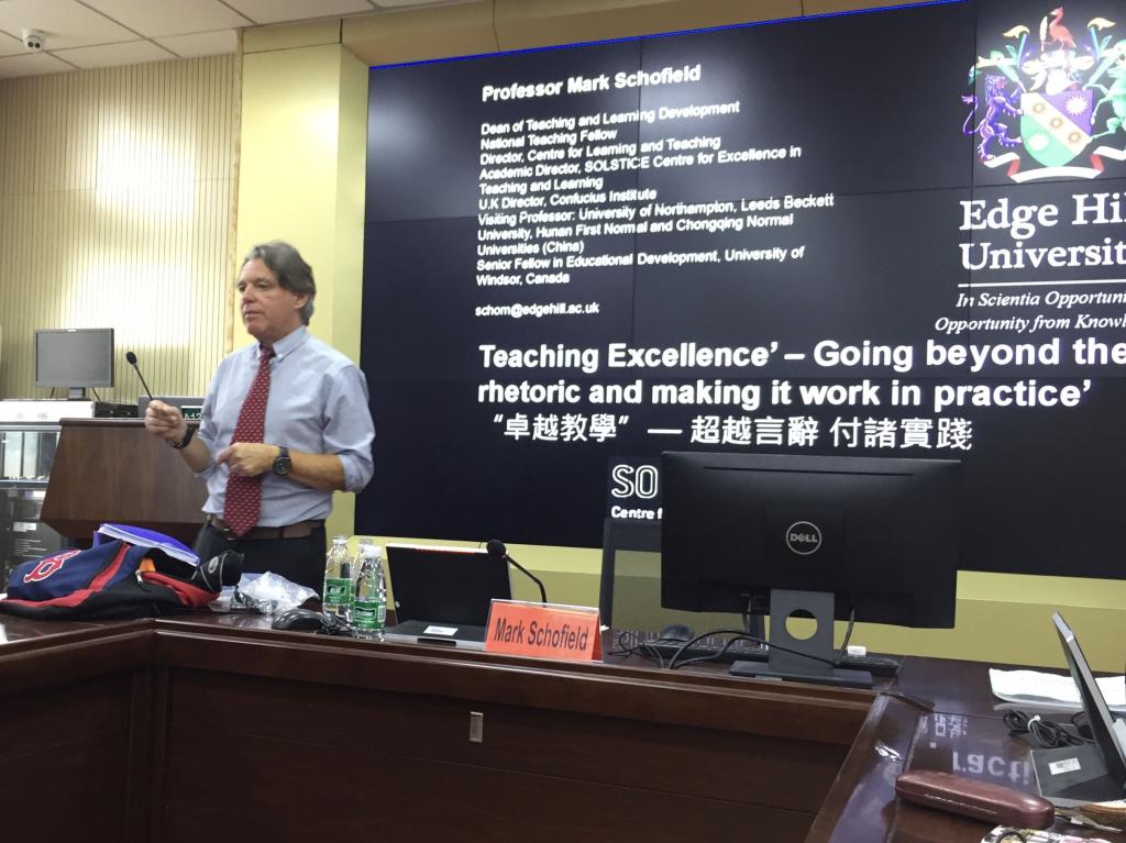 5月15日下午,英国知山大学教学与学习中心主任马克•斯科菲尔德(Mark·Schofield)教授在我校特立楼北栋商务英语谈判室作“卓越教学——超越言辞,付诸实践”专题学术讲座。讲座由教育科学学院蒋蓉院长主持。