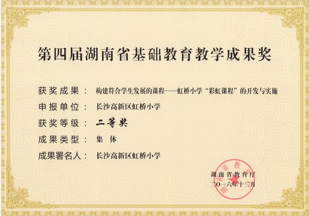 虹桥人以“给孩子一个幸福而有意义的童年”为办学理念,致力于学校内涵建设,多元发展。学校先后获得“全国学校体育联盟(教学改革)实验学校”、“全国阅读教育先进单位”、“湖南省示范家长学校”、“湖南省安全文明校园”、“湖南省现代教育技术实验学校”、“湖南省小学科学课程研究基地”、“湖南省中小学教师培训基地学校”、“湖南省科技创新基地”、“全国青少年校园足球特色学校(首批)”、“长沙市文明单位”、“湖南省红领巾示范学校”、“湖南省经典诵读示范学校”、“长沙市两型示范校”、“长沙市依法治校先进单位”、“长沙市常规管理先进单位”等荣誉称号。