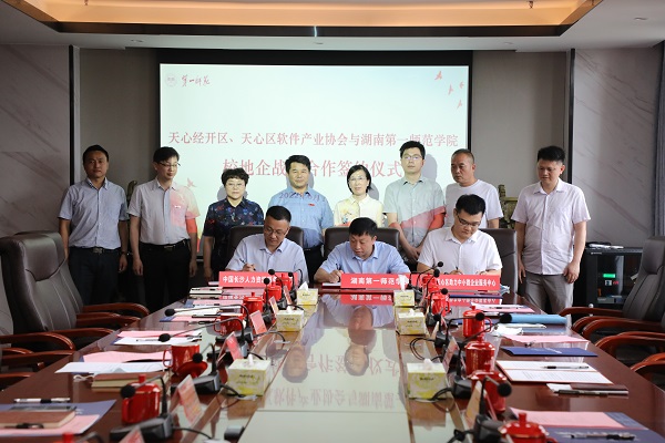 我校科研处/产教融合与校地企合作处、教务处、招生就业处、电子信息学院、计算机学院负责人和长沙天心经济开发区、长沙市制造业发展促进中心、中国长沙人力资源服务产业园、天心区工信局、天心区助力中小微企业服务中心等有关部门领导参加签约仪式。